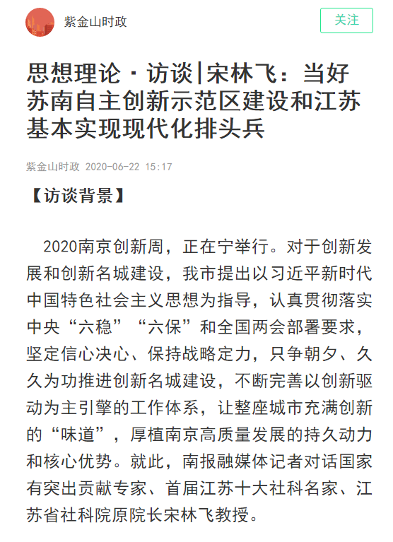 思想理论·访谈|宋林飞:当好苏南自主创新示范区建设和江苏基本实现现代化排头兵