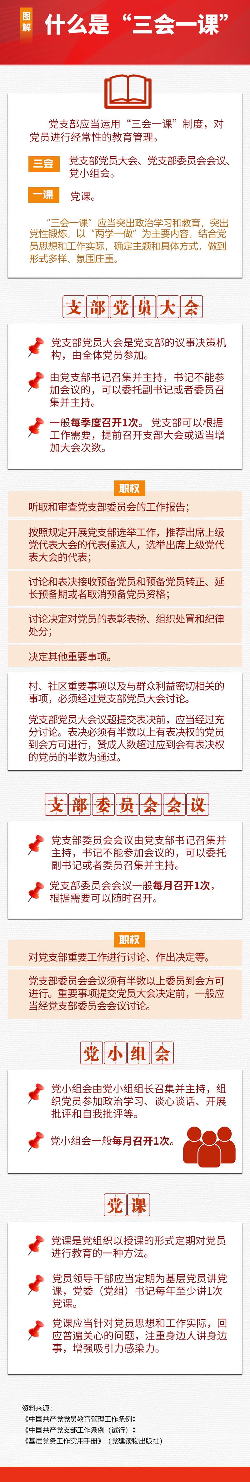 党员必须参加党员大会、党小组会和上党课,党支部要定期召开支部委员会会议。“三会一课”要突出政治学习和教育,突出党性锻炼,坚决防止表面化、形式化、娱乐化、庸俗化。领导干部要以普通党员身份参加所在党支部或党小组的组织生活,坚持党员领导干部讲党课制度。通过“三会一课”,要向党员灌输党的基本理论、基本知识、基本要求,组织党员学习党章和党的理论创新成果,定期进行党性分析体检,对照党章和入党誓词查找不足,明确努力方向,做合格党员。