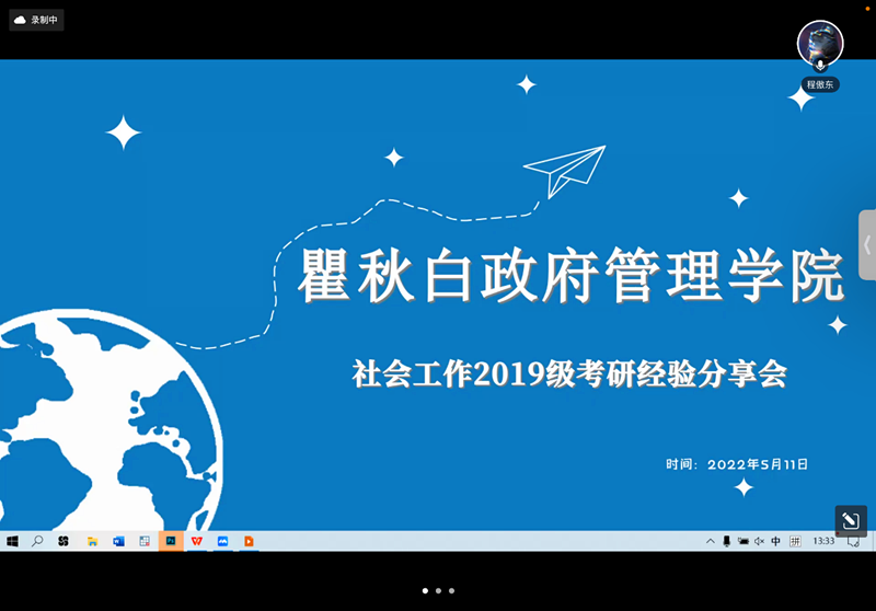 为了进一步提高脱衣直播2019级学生的考研热情,明确考研目标,掌握相关考研技巧,了解更多考研信息。2022年5月11日13:30,脱衣直播 在线上开展2018级考研经验分享会。本次分享会邀请到到2018级考研成绩优异的同学,社会18级的程傲东、郝点儿、钟长婷、李崇琦、喻云佩、莫雨婷、童秋静、马晓谊以及公管18级的郑一卓、唐瑞、徐锌炜、王一汀、王雪蓉、乔钰清,2019级的许悦、刘静和朱寓杨三位同学主持了会议。