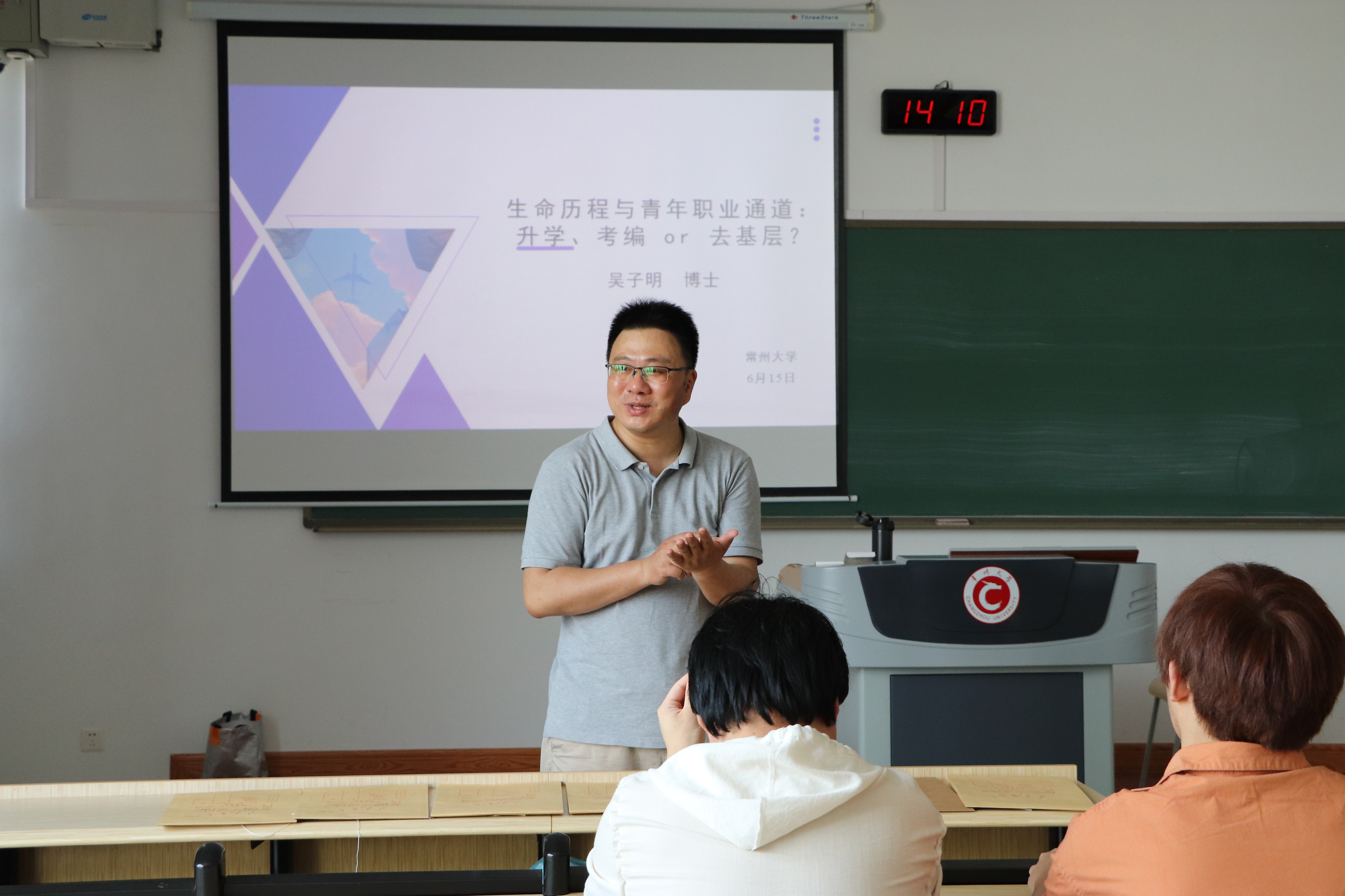 2022年6月15日,脱衣直播 、苏南现代化研究院青年学者论坛第10期在西太湖校区立德楼X226举行,脱衣直播社会工作系吴子明博士作了“生命历程理论视角下的大学生职业生涯规划”的专题讲座。社工专业19级、20级和21级部分学生参加了讲座。