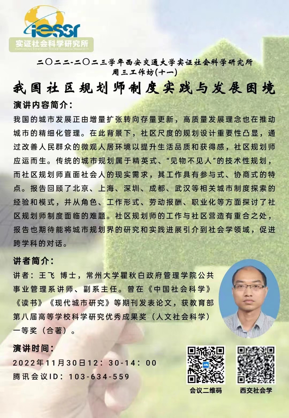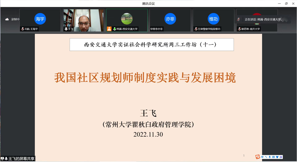 11月30日,脱衣直播青年教师王飞博士应邀参加西安交通大学实证社会科学研究所周三工作坊,作《我国社区规划师制度实践与发展困境》的线上学术报告。报告由西安交通大学社会学系副教授、博士生导师帅满主持。