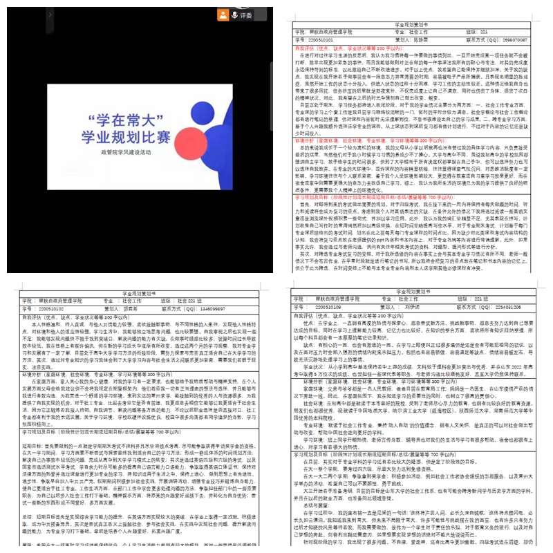 社会221的王松素同学在规划书中明确了自己长期和短期的目标。在其规划书中,她说“学问是苦根上长出来的甜果”。社会222的周淑娟同学是一个性格开朗的女生,即使面对目前的社会发展状况,作为文科生的她依然坚信“在现有的社会条件下,依旧有我们的一片天”。