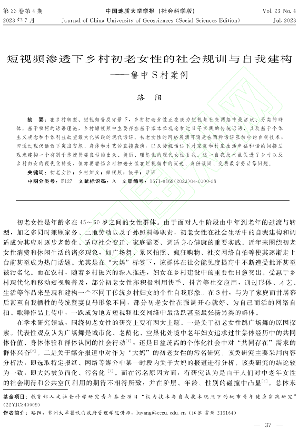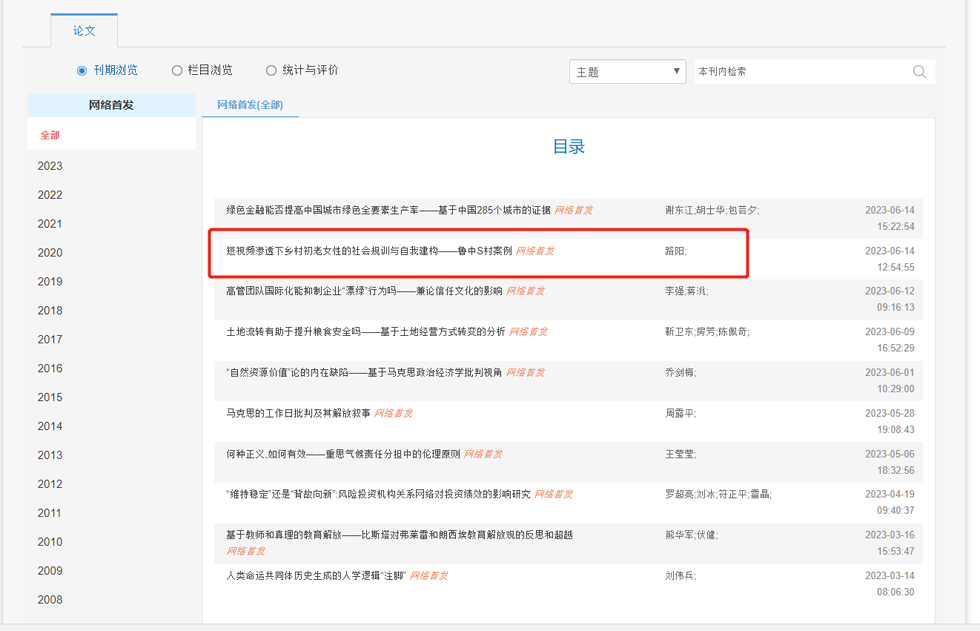 脱衣直播青年教师路阳博士在《中国地质大学学报(社会科学版)》2023年第4期发表文章《短视频渗透下乡村初老女性的社会规训与自我建构——鲁中S村案例》(网络首发)。