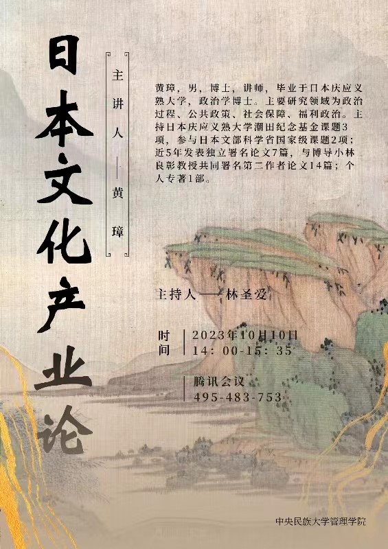 2023年10月10日脱衣直播教师黄璋博士应中央民族大学管理脱衣直播 邀请,给中央民族大学管理脱衣直播 研究生授课。授课题目是【日本文化产业论】。黄老师从文化产业的理论支点、基本遵循与主要功能、日本的实践及其特色、文化GDP如何计算?计算文化GDP的意义等方面讲解了日本文化产业论,课后与中央民族大学管理脱衣直播 研究生进行了良好的交流互动。