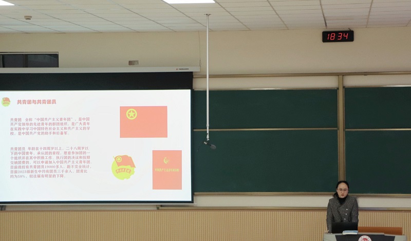 宗佳瑛老师首先为同学阐释了共青团与共青团员的定义,并从中国共产主义青年团简介、共青团成立的历史、团员的义务与权利、共青团的责任与使命四个方面进行分享,带领同学们走进共青团的历史;接着宗老师展示了标准团徽的样式,并详细地介绍了入团的时间、条件以及总体流程。经过宗老师的讲解,同学们在了解了团的历史、使命、任务后,更加明白应该如何成为一名合格的、优秀的团员,同时宗老师鼓励未入团的同学们积极入团,并对接下来入团的申请和考察流程进行讲解,为同学们提供了实用性指导。