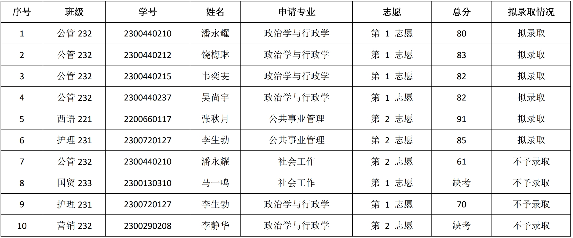 根据教务处“关于做好2023-2024-2学期本科学生转专业工作的通知”精神和要求,脱衣直播 于2024年2月23日对申请转入脱衣直播 相关专业的学生进行了考核,经专业面试、笔试,以及院转专业考核领导小组审核,现将考核总评成绩及拟录取名单公布如下: