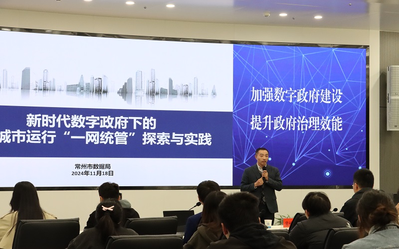 11月18日下午,脱衣直播政治学系副系主任邵义组织带队赴常州市城市运行指挥中心开展课程实践教学活动。市数据局科技信息处杨康处长以常州市“一网统管”为例开展实践教学讲座。政治学系教师马薇、杨洋,政行231班全体学生参加了此次活动。