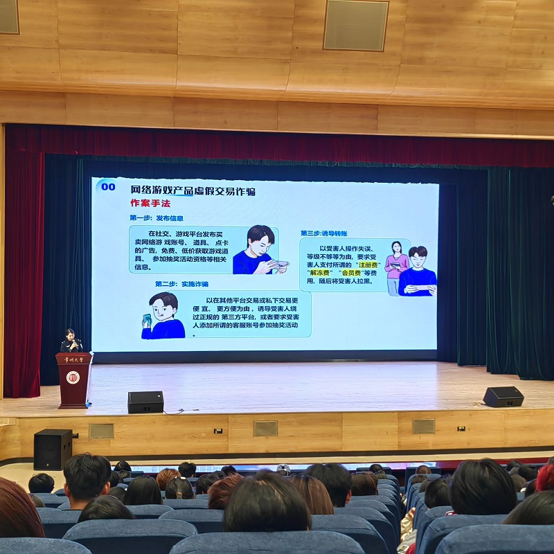 讲座中,宣讲民警详细介绍了当前高校电信诈骗的常见类型,包括游戏交易类诈骗、虚假购物类诈骗、虚假博彩类诈骗、冒充熟人类诈骗、兼职刷单类诈骗、裸聊敲诈类诈骗等,并结合近年来发生在校园内的真实案例,深入剖析了诈骗分子的作案手法和心理策略。通过案例分析,同学们了解了诈骗手法、防范措施;并提醒同学们增强个人防范意识,时刻保持警惕,从源头上做好防范工作。