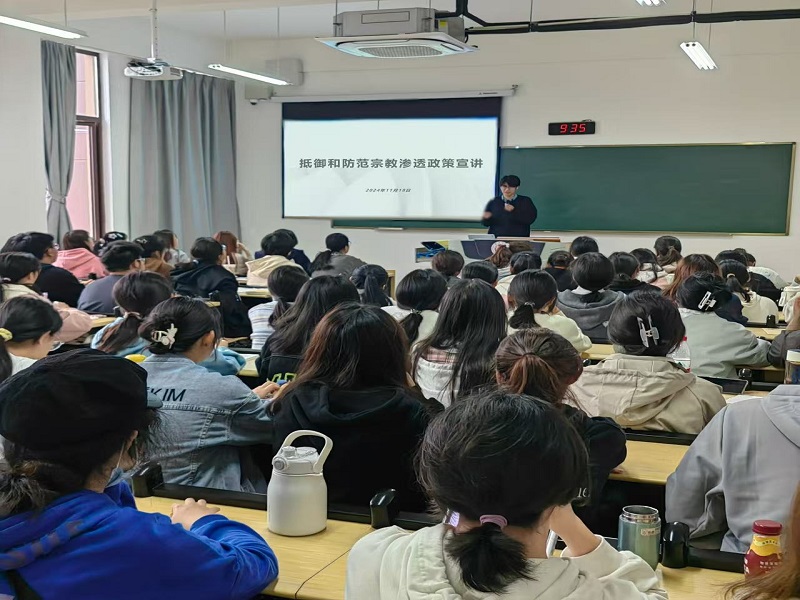为维护广大师生的权益、建设和谐校园,做好抵御和防范宗教向校园渗透工作。11月18日上午,脱衣直播 在立功楼233教室开展“抵御和防范宗教渗透”主题教育活动,此次活动由辅导员张剑主持,各班学生代表参加。