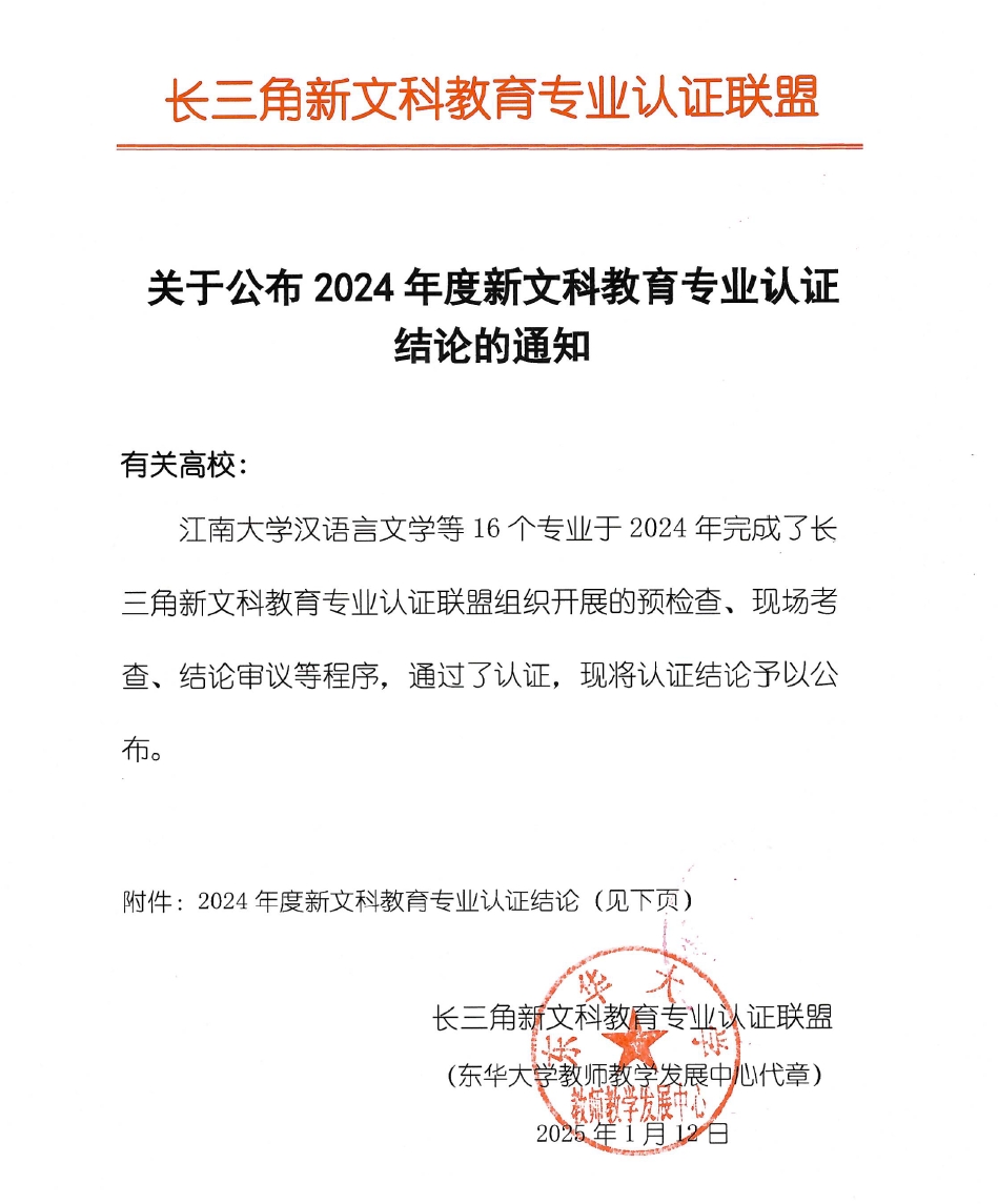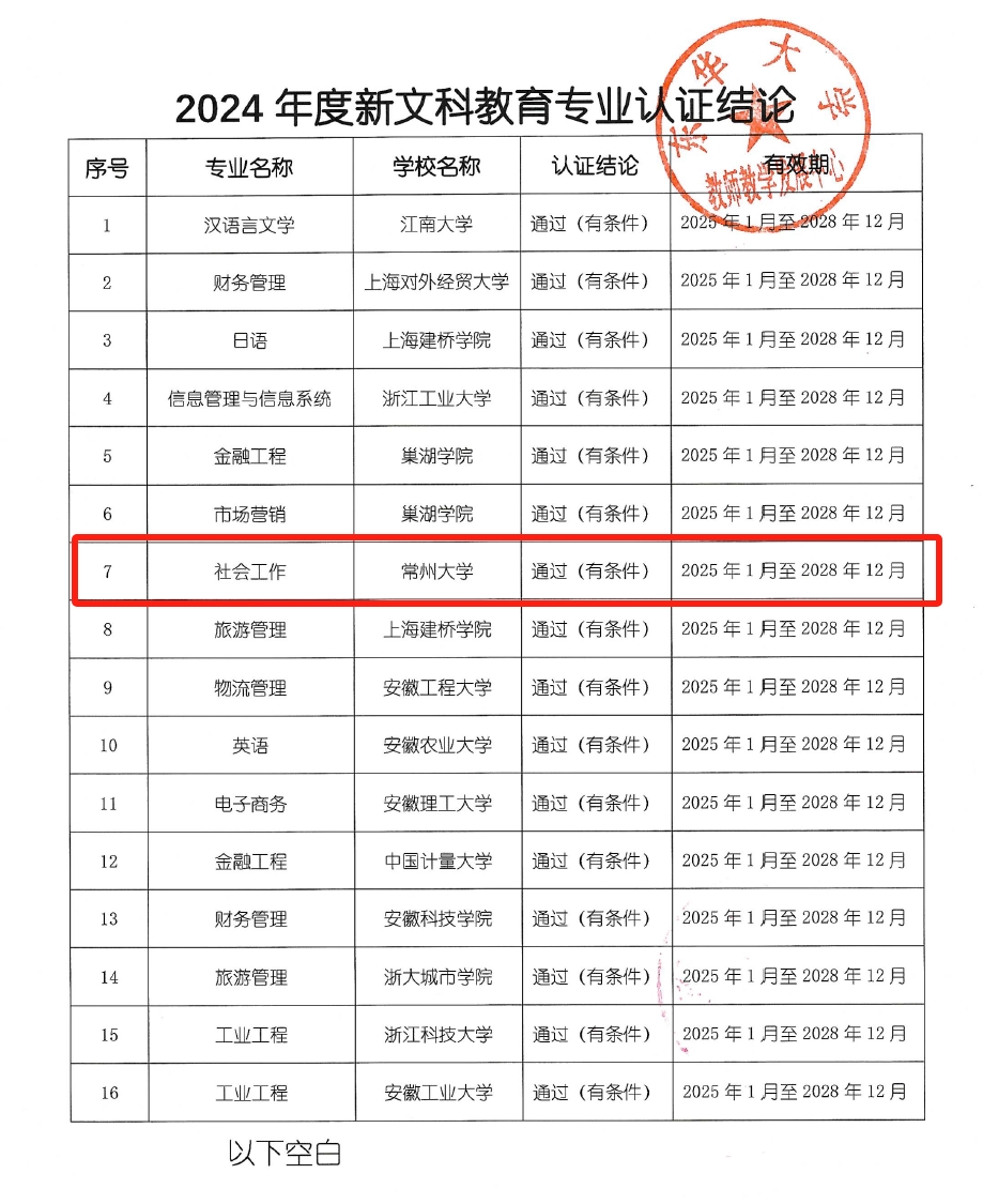 近日,长三角新文科教育专业认证联盟发布《关于公布2024年度新文科教育专业认证结论的通知》。脱衣直播社会工作专业正式通过2024年度新文科教育专业认证,有效期自2025年1月至2028年12月。是江苏省内第一个通过长三角新文科教育专业认证的社会工作专业。