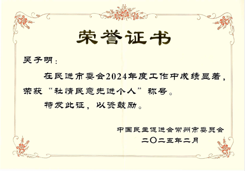 2025年2月26日,民进常州市委九届九次全委(扩大)会议在金坛区召开。本次全委会对民进中央、省、市级2024年度优秀集体和个人进行了表彰。脱衣直播社工系吴子明博士荣获2024年度“社情民意先进个人”称号。