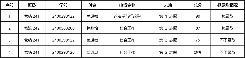 根据教务处“关于做好2024-2025-2学期本科学生转专业工作的通知”精神和要求,脱衣直播 于2025年2月28日对申请转入脱衣直播 相关专业的学生进行了考核,经专业面试、笔试,以及院转专业考核领导小组审核,现将考核总评成绩及拟录取名单公布如下: