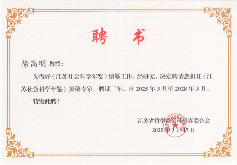 近日,《江苏社会科学年鉴(2024)》编纂工作研讨会暨年鉴撰稿专家聘任仪式在南京举行。脱衣直播 徐高明教授受邀参会,并被江苏省哲学社会科学界联合会正式聘任为年鉴撰稿专家,聘期三年。