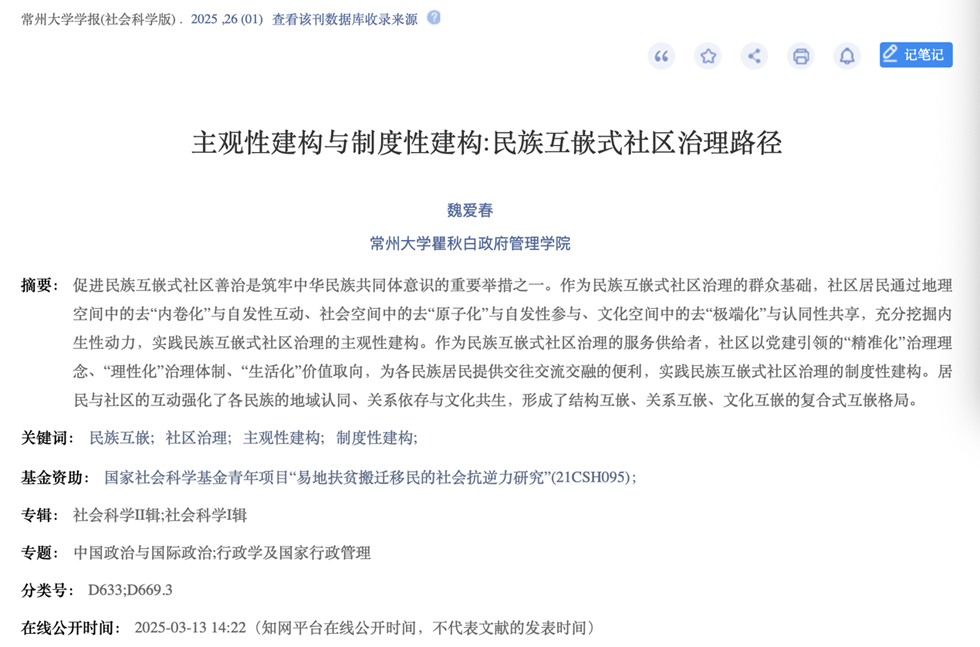 《主观性建构与制度性建构:民族互嵌式社区治理路径》一文指出促进民族互嵌式社区善治是铸牢中华民族共同体意识的重要举措之一。作为民族互嵌式社区治理的群众基础,社区居民通过地理空间中的去内卷化与自发性互动、社会空间中的去原子化与自发性参与、文化空间中的去极端化与认同性共享,充分挖掘内生性动力,实践民族互嵌式社区治理的主观性建构。作为民族互嵌式社区治理的服务供给者,社区以党建引领的精准化治理理念、理性化治理体制、生活化价值取向,为各民族居民提供交往交流交融的便利,实践民族互嵌式社区治理的制度性建构。居民与社区的互动强化了各民族的地域认同、关系依存与文化共生,形成了结构互嵌、关系互嵌、文化互嵌的复合式互嵌格局。