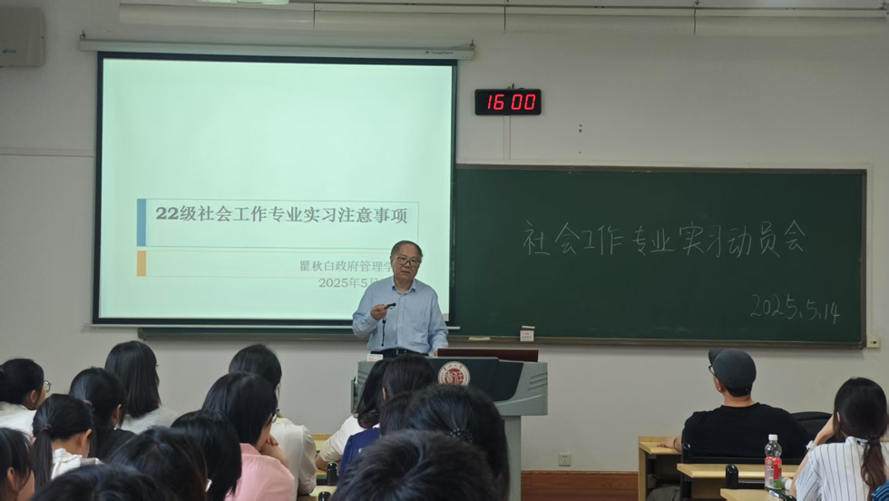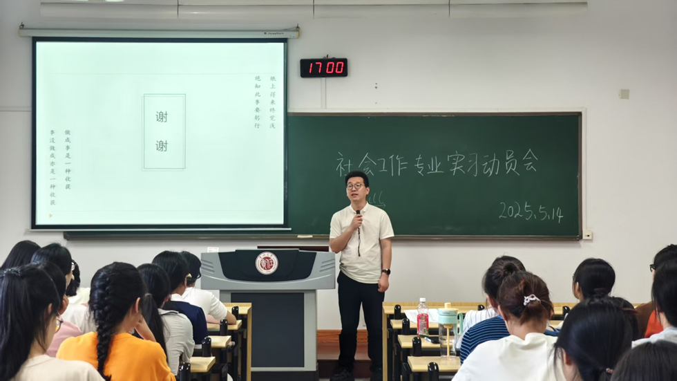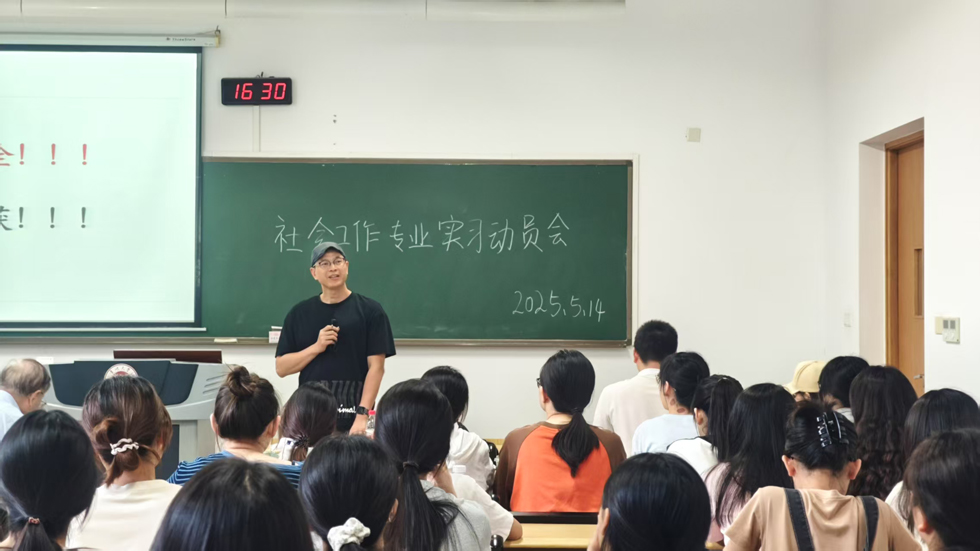 2025年5月14日下午,脱衣直播 在立德楼112教室召开2022级本科生社会工作专业实习动员会。脱衣直播 院长宋林飞、副院长翟进、社会工作系主任姚星亮、脱衣直播 辅导员及社会工作专业教师出席会议,2022级社会工作专业全体学生参加会议。