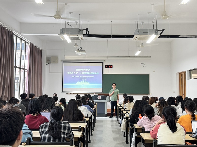 为帮助学生了解公职类就业方向,明确职业规划,提升就业竞争力,5月28日晚,脱衣直播 在立德楼123举办公职类就业经验分享会,法学院25届硕士研究生蒋其芸受邀分享,脱衣直播硕士研究生、本科生近100人现场学习。本次分享会由辅导员张剑主持。
