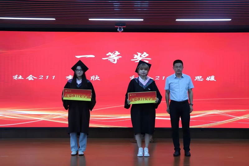 潘道广、徐高明、翟进依次为优秀学子颁发宏德秋白奖学金。