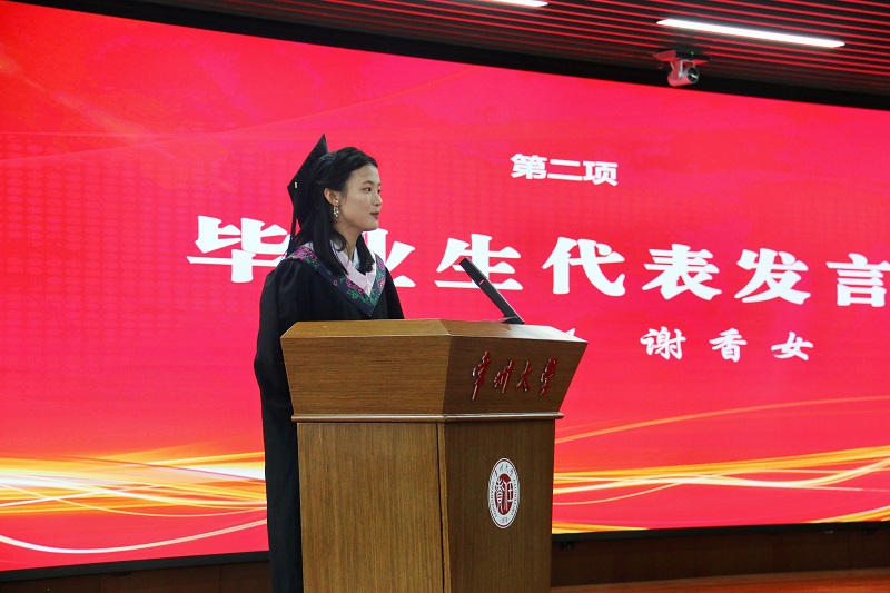 毕业典礼在庄严的国歌声中拉开了序幕。毕业生代表社会211谢香女上台发言,她回顾了四年的校园时光,分享了自己的成长感悟,表达了对学院培养、师长教导和同学陪伴的感恩,也展现出了对奔赴新征程的信心。