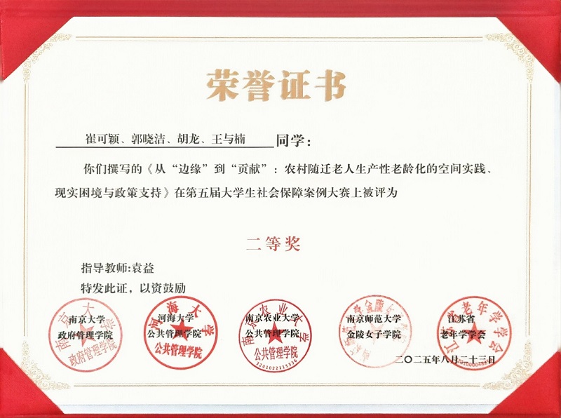 这次大赛由南京大学、河海大学、南京农业大学、南京师范大学、江苏省老年学学会联合主办,南京大学政府管理脱衣直播 承办。大赛共收到来自全国各大高校共计219份参赛作品,脱衣直播学生参赛作品《从“边缘”到“贡献”:农村随迁老人生产性老龄化的空间实践、现实困境与政策支持》荣获二等奖。