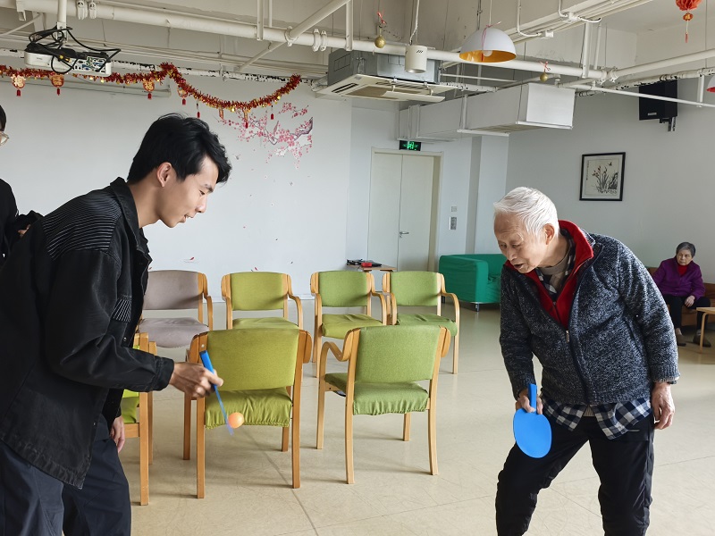 活动中,同学们与老人亲切交谈,耐心倾听他们讲述往事。针对老人实际情况,同学们通过双打乒乓球、做手指操、演唱经典老歌、表演舞蹈等方式,唤起他们的注意力与互动热情。欢声笑语不时在活动室内回荡,老人们的脸上也露出了甜蜜的笑容。活动期间,老人和同学们频繁互动,以自己独特的方式现场表演戏曲、歌曲,活动现场气氛温馨而感人。