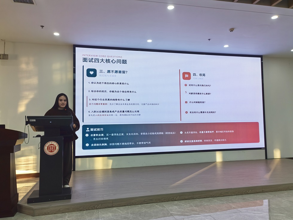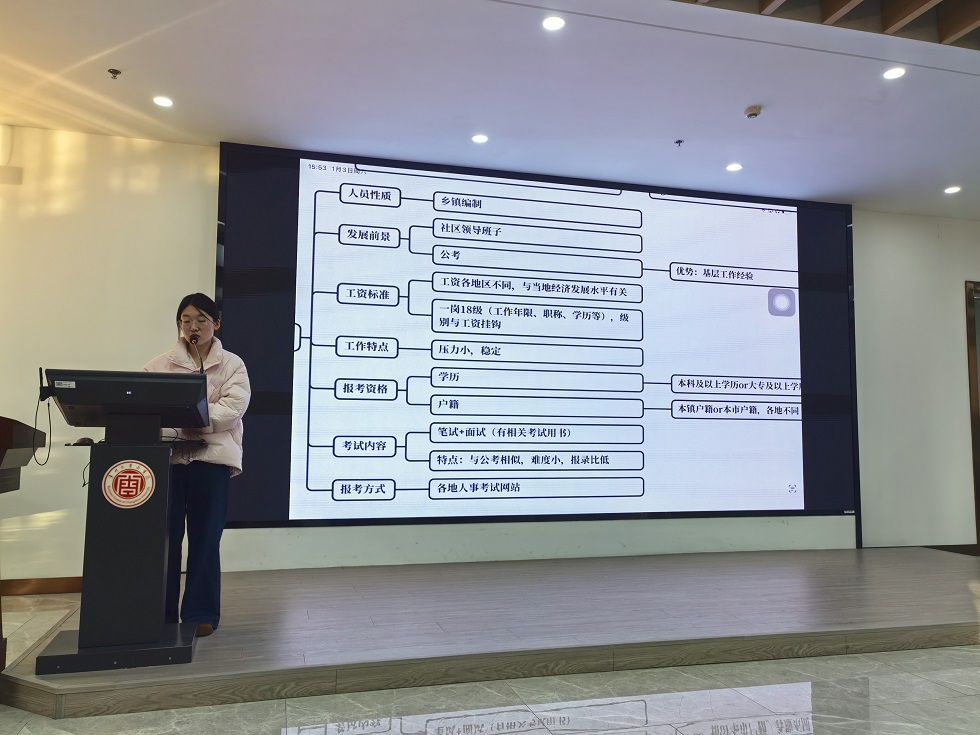 会上,向依卓结合自身考研经历,从如何选择考研院校、备考节奏把控、资料筛选、心态调节等方面,细致讲解考研备战的关键要点。吕炳炎则聚焦学术型研究生生活,重点分享了专业深造过程中的科研方法与成长收获。路欣欣结合社区工作者经历,剖析专业对口就业的发展路径与职业价值;王姝犀结合国企工作经历,围绕就业面试技巧、简历制作等内容,为同学们提供实用可行的求职方法。最后,班主任和辅导员提醒同学们要夯实专业理论与实践,拓宽视野,锻造综合能力,进一步强化职业规划意识,确定好考研和就业方向。