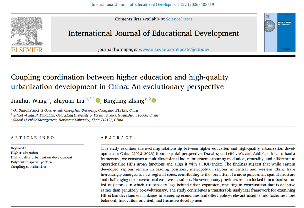 论文《Coupling Coordination between Higher Education and High-Quality Urbanization Development in China: An Evolutionary Perspective》发表于 International Journal of Educational Development 2026年第122卷。研究从空间视角系统考察了2013—2023年中国高等教育与高质量城镇化发展的演变关系。借鉴列斐伏尔与艾迪的批判城市主义理论框架,研究构建了包含中介性、中心性与差异性三个维度的高等教育城市功能指标体系,并与高质量城镇化发展指数进行耦合协调分析。研究发现,虽然东部发达地区仍保持整体优势,但中西部大都市区域正逐渐成长为新的区域核心,推动我国城市发展格局呈现更加多中心的空间结构,对传统的东—西梯度格局形成新的调整。同时,一些地区仍处于“城镇化引领”的发展路径中,高等教育能力滞后于城市扩张,二者关系更多表现为适应性协调而非协同演化。研究提出了一个可推广的分析框架,为理解新兴经济体中高等教育与城市发展的互动关系提供了新的研究视角,并为促进更加均衡、创新驱动和包容性的城市发展提供了政策启示。